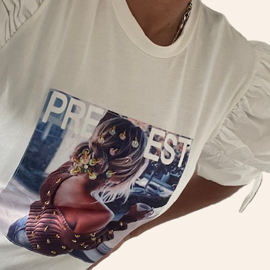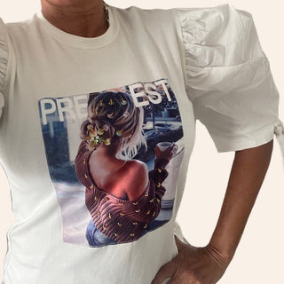 “Effortlessly chic, endlessly cozy.” This blouse is designed in a crisp off white cotton blend with stretch, it features bold, voluminous puff sleeves for a dramatic silhouette. A standout graphic on the front showcases a chic woman in a cozy brown sweater with open shoulders, accented by glitter-like details that shimmer with every move.