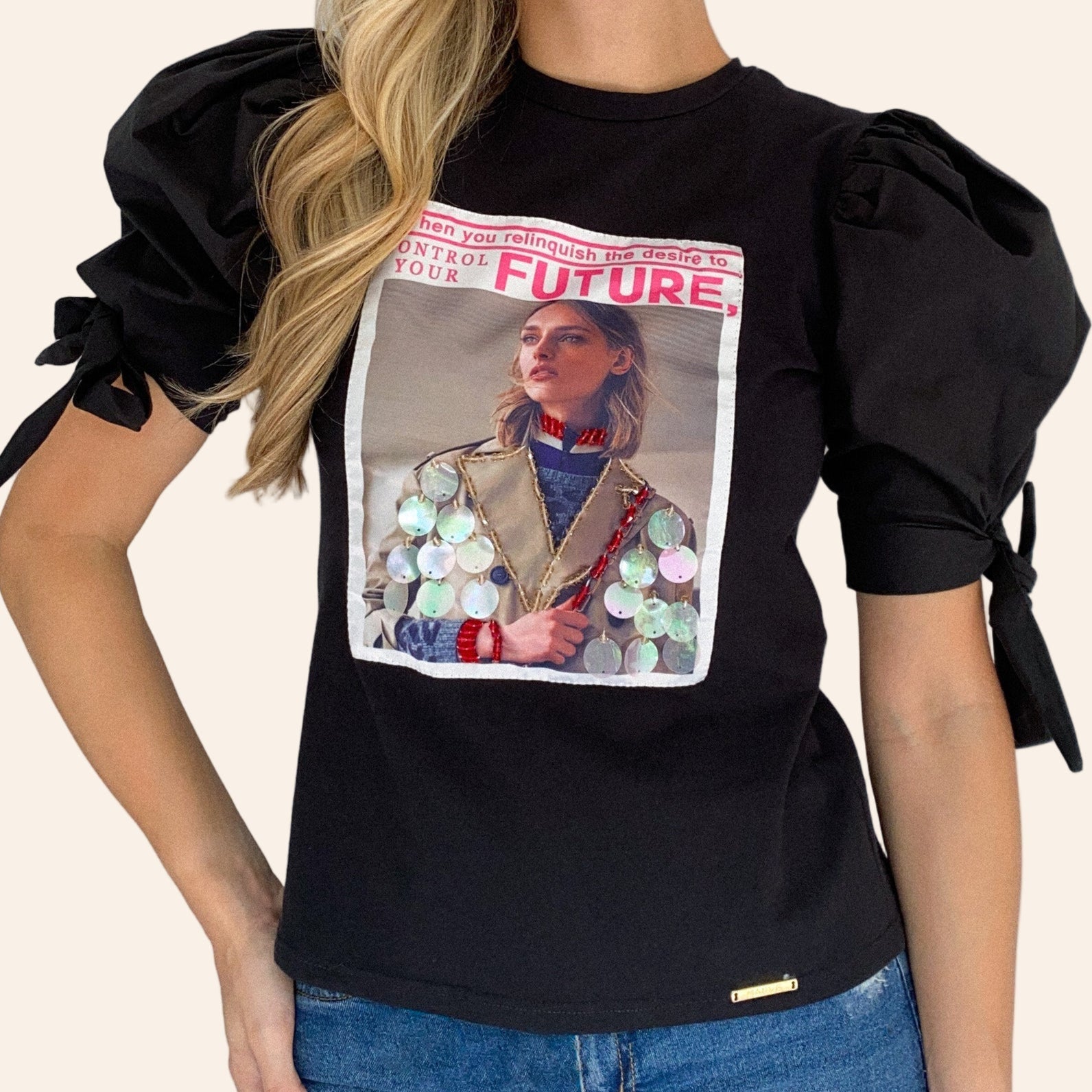 Make a statement with The Empress Top, a black shirt designed for style and self-expression. Crafted from a comfortable polyester-spandex blend, it features voluminous puff sleeves gathered at the shoulders and cinched at the cuffs with ties, creating a dramatic yet flattering silhouette. A bold, centered graphic showcases a patterned figure along with the inspiring message: “When you relinquish the desire to control your future.” Perfect for casual outings, coffee dates, or when you want your look to reflect confidence and individuality.