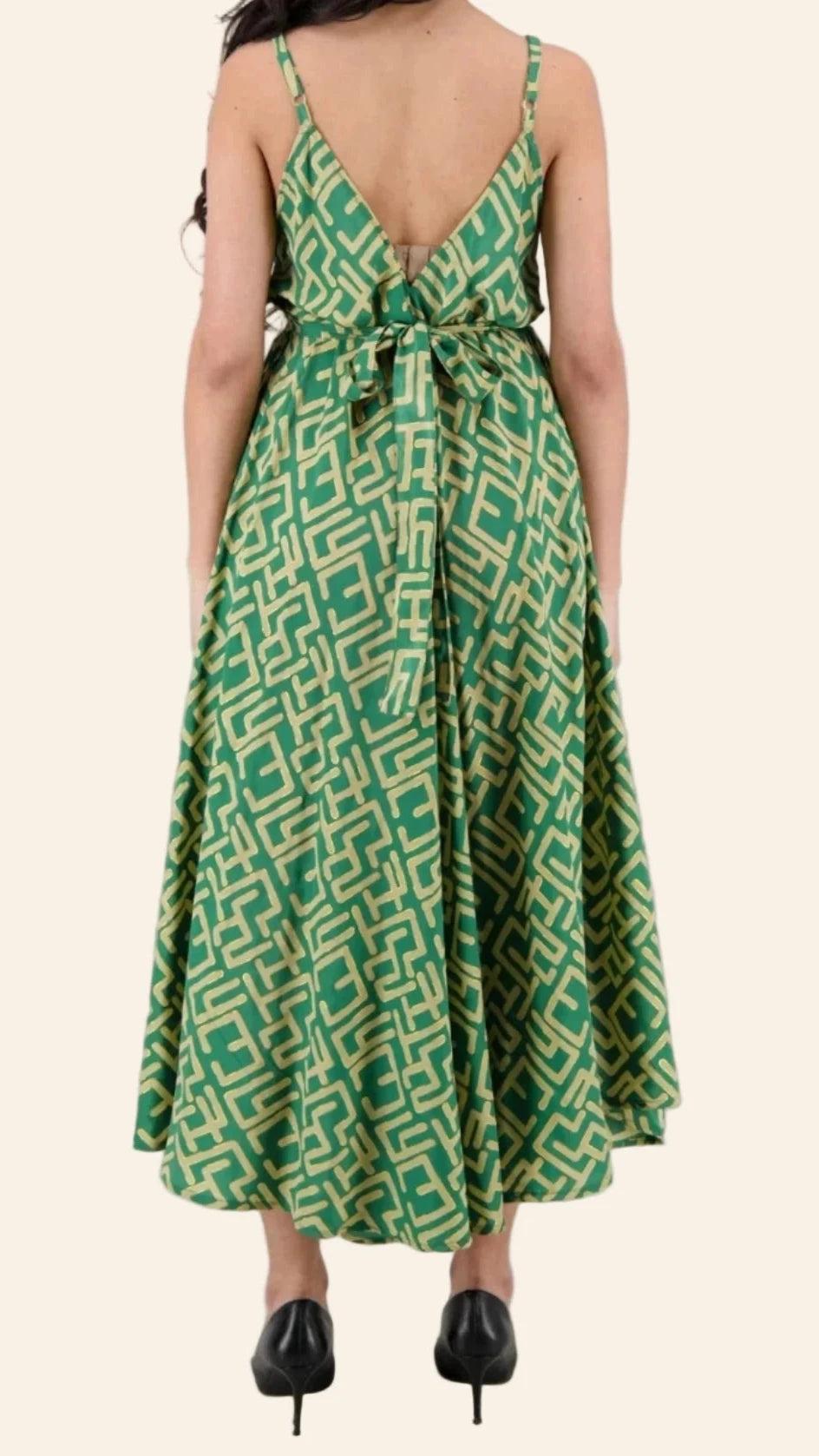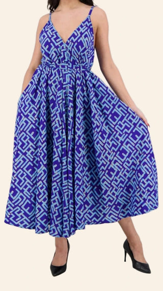 Elevate your summer wardrobe with this statement-making maxi dress featuring a bold geometric print. Made from airy 100% polyester, it's designed with a flowy silhouette, adjustable spaghetti straps, and a tie-around waist that flatters every figure. The maze-inspired pattern adds a modern edge, making it a standout choice for everything from sunny vacations to rooftop dinners