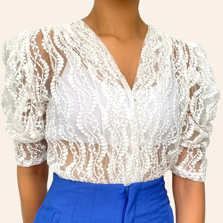 - High-waisted royal blue tailored trousers + metallic heels → chic and regal, letting the lace bodysuit be the statement piece.