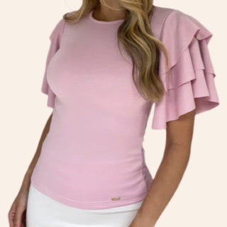 The Radiance Blouse is a statement piece designed to elevate any wardrobe. Crafted from a stretchy polyester-spandex blend with a subtle semi-gloss finish, it features elegant ruffle sleeves that add movement and charm. Versatile and chic, making it perfect for both sophisticated office looks and stylish evenings out.