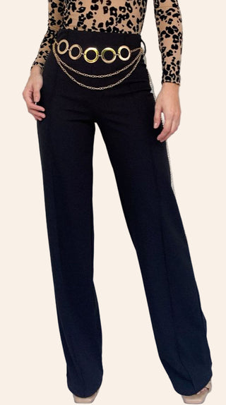 Luxury in every detail, power in every step.” The Gilded Edge Pants bring modern edge and vintage allure together with a sleek black silhouette, flared bell-bottom cut, and bold gold accents at the waist. Crafted in a stretch spandex-polyester blend, these statement trousers offer both comfort and commanding style, making them perfect for elevated evenings or standout city looks